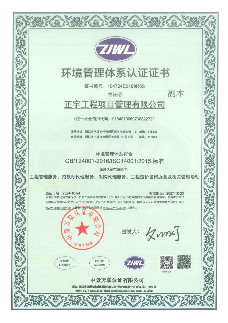 正宇工程項目管理有限公司成立于2009年,注冊資金6080萬,注冊地為浙江省寧波市杭州灣新區。公司擁有國家住建部頒發的工程造價企業甲級資質、招標代理資質等等;是一家專業從事工程項目管理、企業管理、政府采購代理服務、招投標代理服務、信息技術咨詢服務及其他技術服務的綜合型工程咨詢公司。